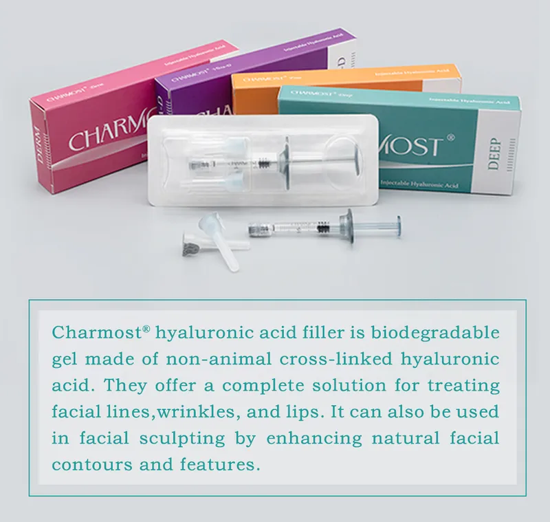 I riempitori cutanei dell'acido ialuronico del ® Di Charmost è Gel biodegradabile fatto di acido ialuronico unito con legami atomici incrociati nessun-animale, sostanza che imita l'acido ialuronico esaurito naturale del corpo. Offrono una soluzione completa per il trattamento la riga facciale grinze e degli orli. Anche può Essere utilizzata nello sculpting facciale aumentando i profili e le caratteristiche facciali naturali